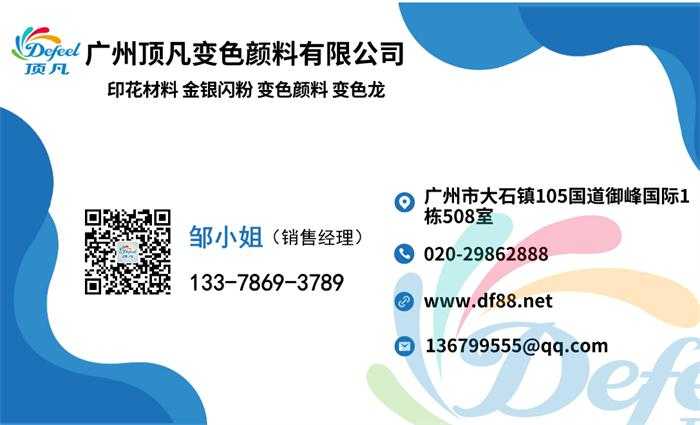 廣州市頂凡顏料是一家集研發(fā)、生產(chǎn)、銷售、服務(wù)于一體的專業(yè)的印花材料及工藝制品材料供應(yīng)商,主要產(chǎn)品有印花膠漿、彩拔漿、珠光粉、夜光粉、反光粉、銅金粉、溫變粉、光變粉、植絨紙、金蔥粉、韓國(guó)膠珠,燙金漿、仿?tīng)C銀漿,熒光粉、發(fā)光粉等。